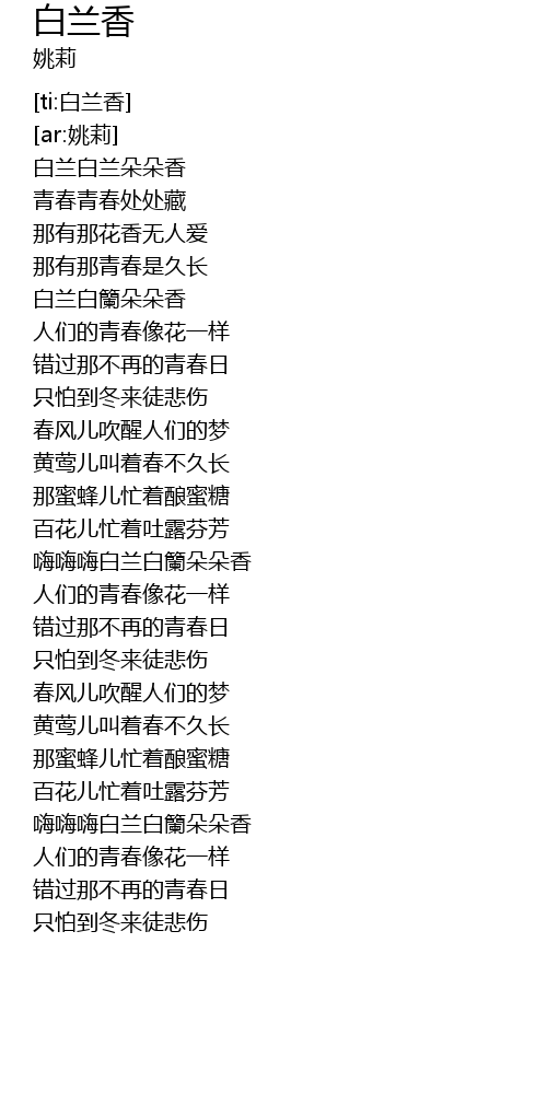 | [00:05.88] | 白兰白兰朵朵香 |