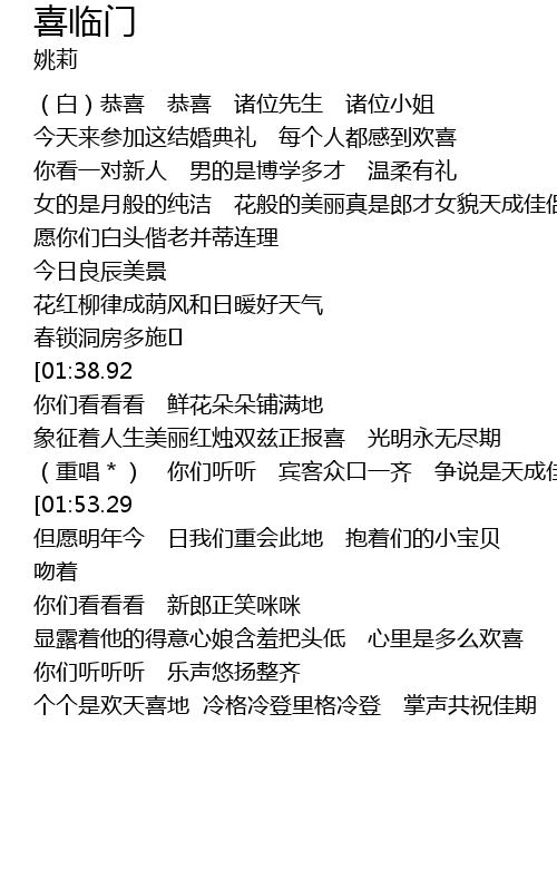 | [02:50.40] | 个个是欢天喜地 冷格冷登里格冷登 掌声共祝佳期 |