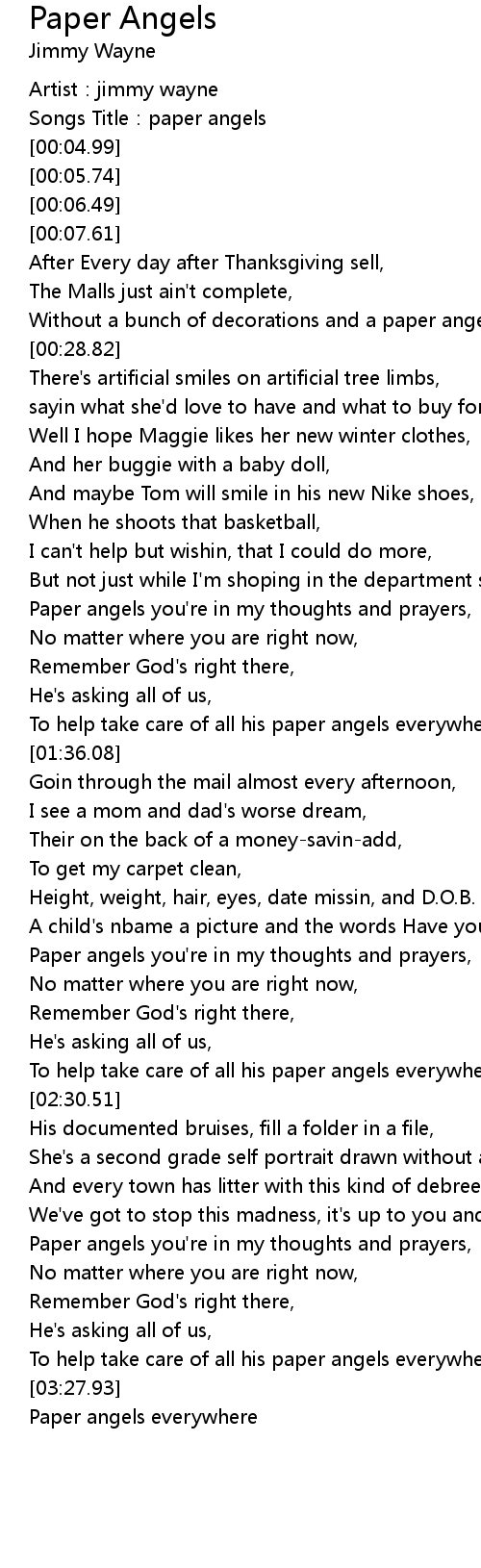 | [01:11.68] | Paper angels you' re in my thoughts and prayers, |