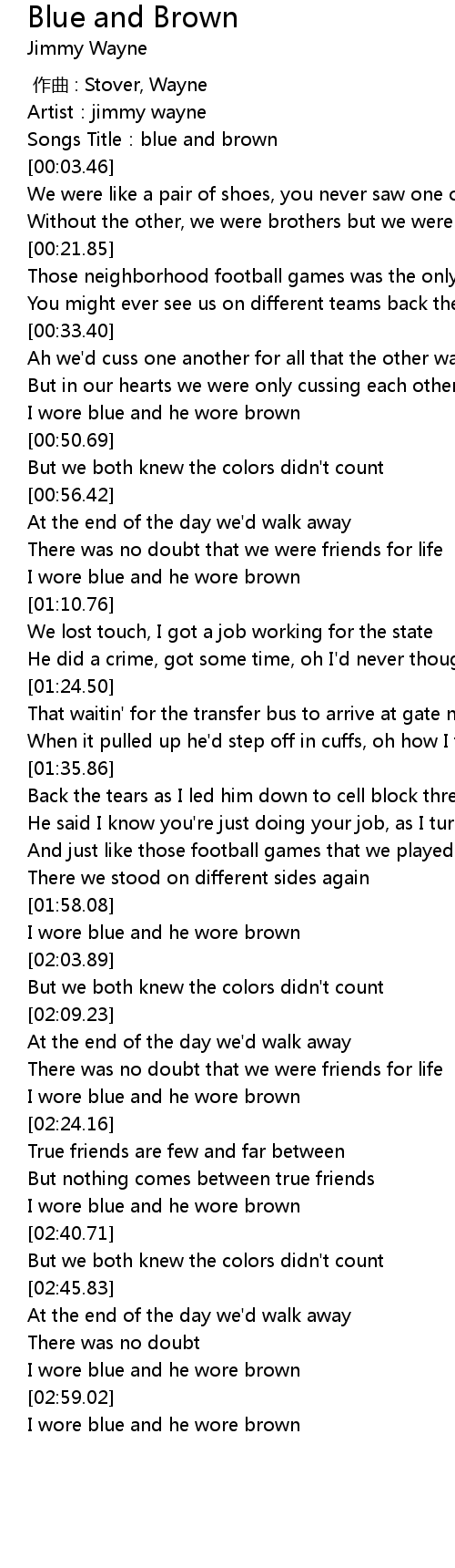 | [02:59.95] | I wore blue and he wore brown |