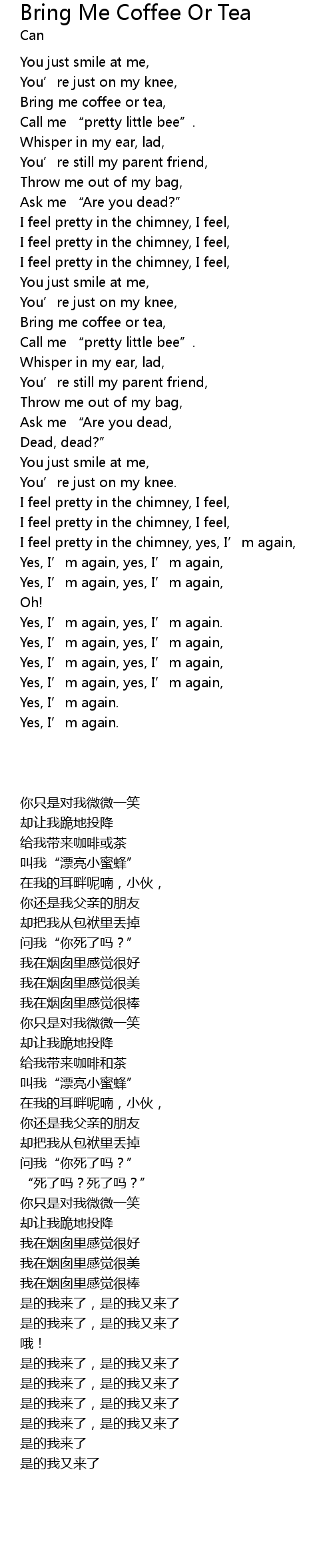 | [00:51.05] | Bring me coffee or tea, |
