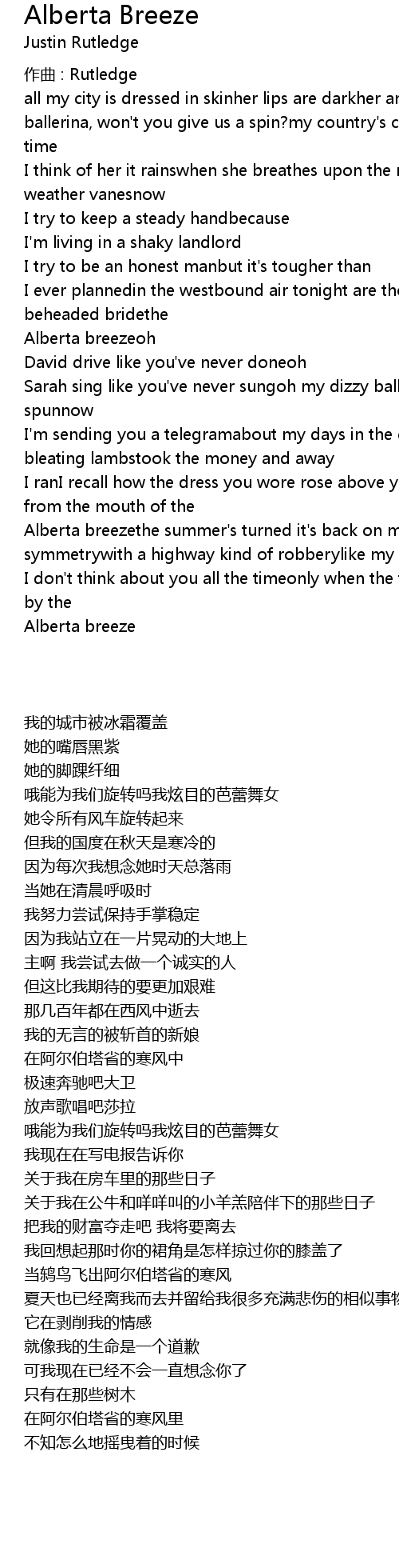 | Alberta breezethe summer' s turned it' s back on me with a sorrowladen symmetrywith a highway kind of robberylike my life was an apologynow | |