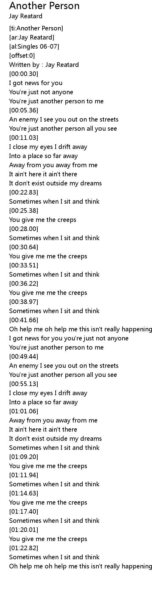 | [00:42.24] | Oh help me oh help me this isn' t really happening |