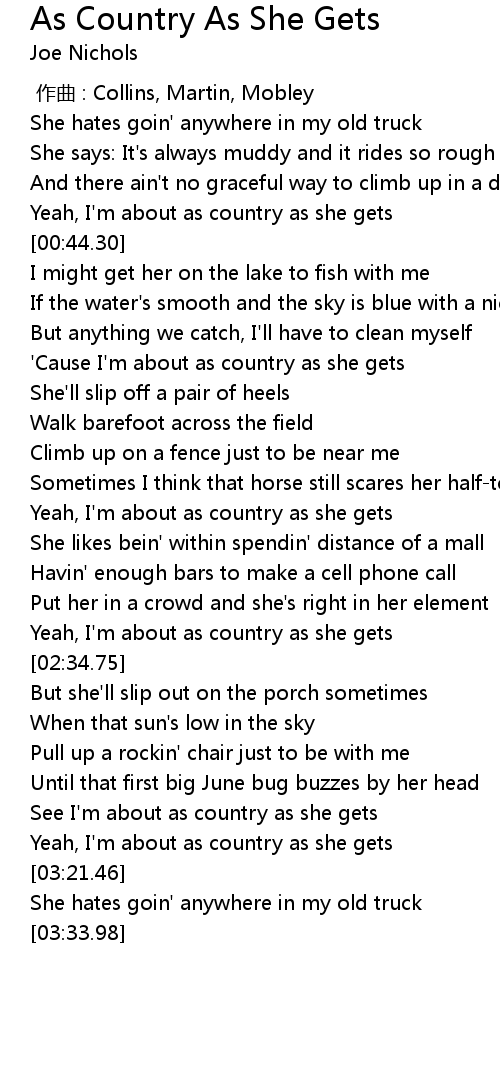 | [03:05.33] | See I' m about as country as she gets |