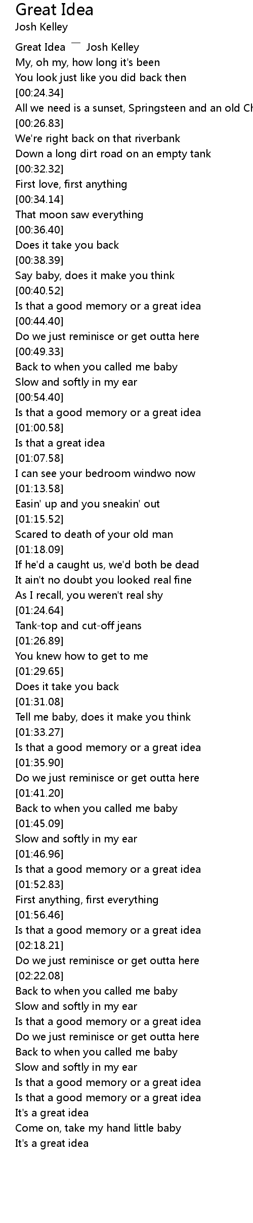 | [00:00.90] | Great Idea ―― Josh Kelley |