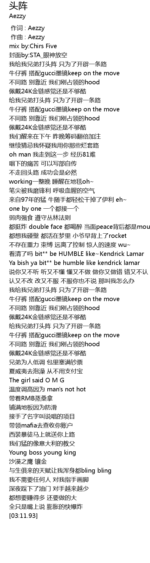 | [01:43.13] | 我给我兄弟打头阵 只为了开辟一条路 |