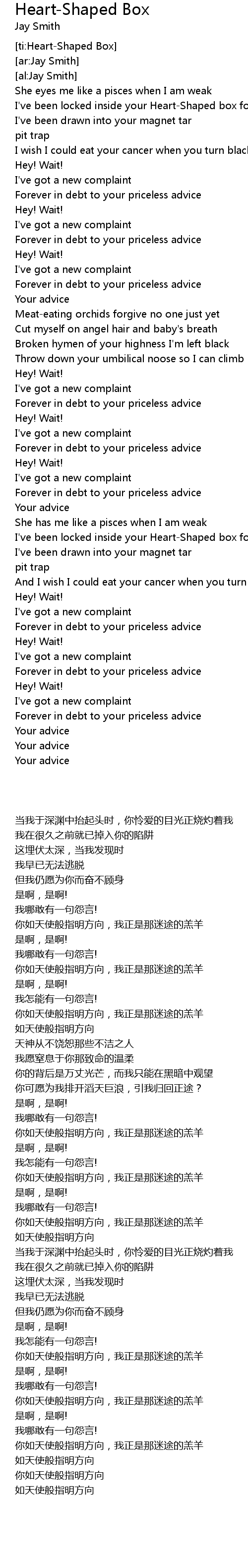 | [00:20.84] | I've been locked inside your Heart-Shaped box for weeks |