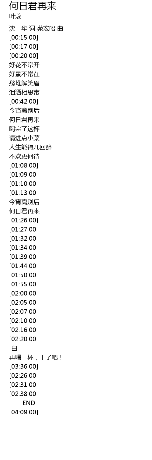 | [03:43.00][02:31.00] | 何日君再来 |