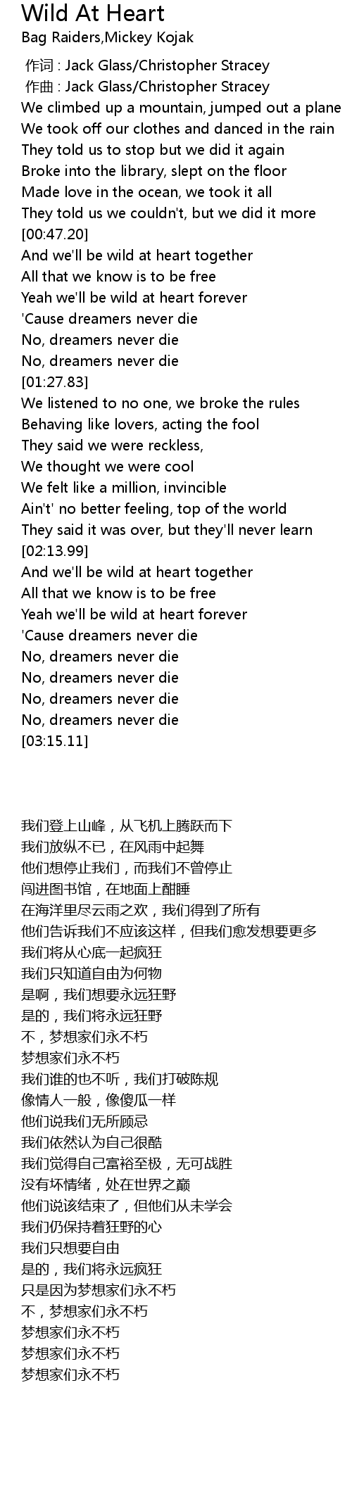 | [00:59.65] | Yeah we'll be wild at heart forever |