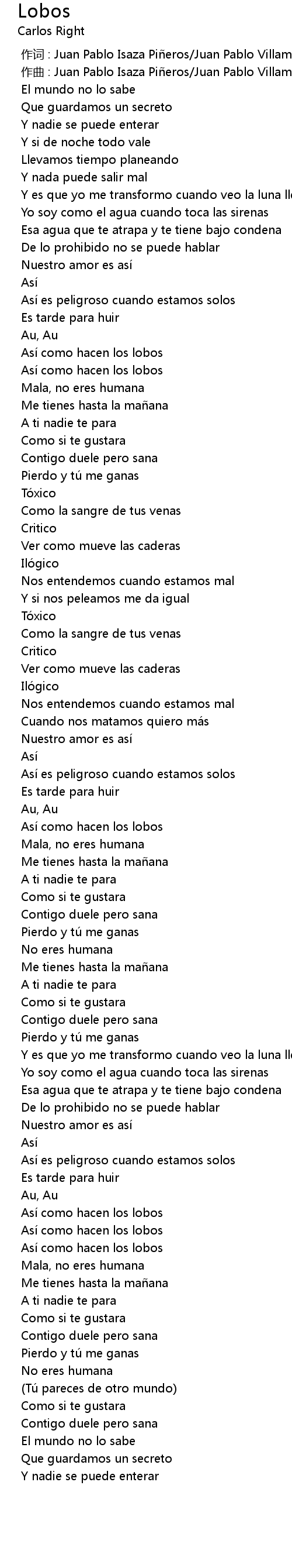 | [00:00.000] | 作词 : Juan Pablo Isaza Piñeros/Juan Pablo Villamil Cortes |