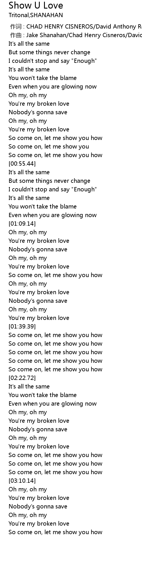 | [00:01.000] | 作曲 : Jake Shanahan/Chad Henry Cisneros/David Anthony Reed |