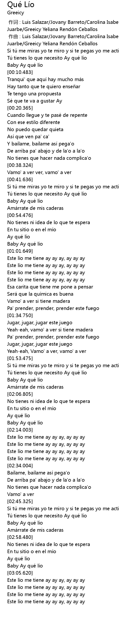 | [00:47.258] | Tú tienes lo que necesito Ay qué lío |