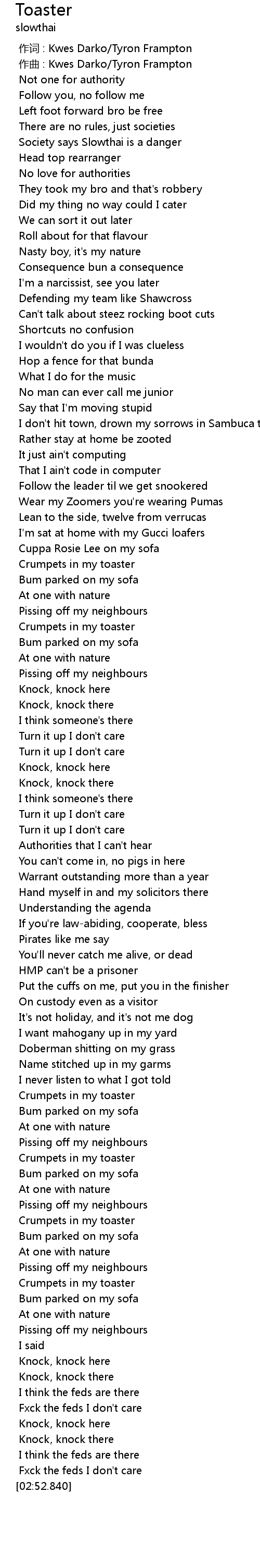 | [02:49.364] | Fxck the feds I don' t care |