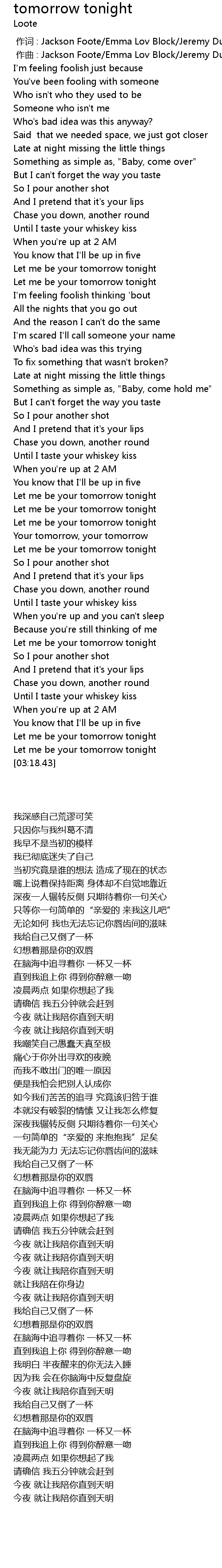 | [00:52.50] | Let me be your tomorrow tonight |