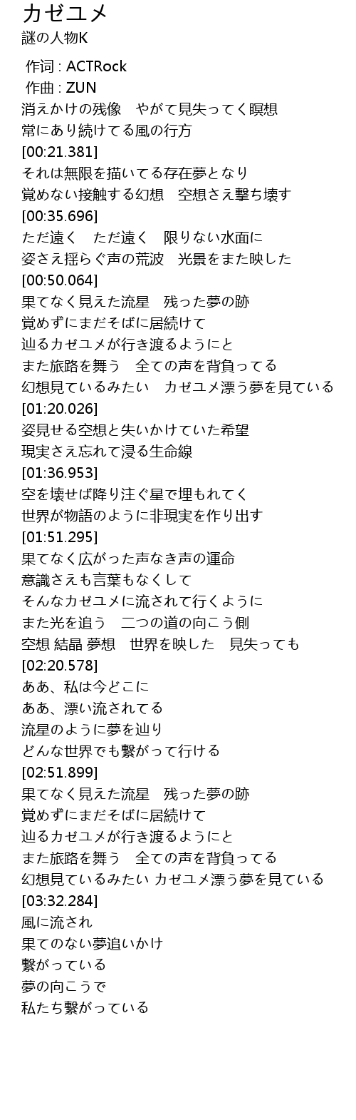 | [03:25.100] | 幻想見ているみたい カゼユメ漂う夢を見ている |