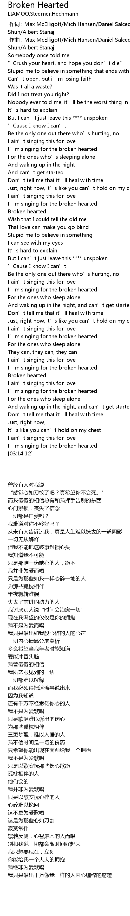 | [03:10.68] | I' m singing for the broken hearted |