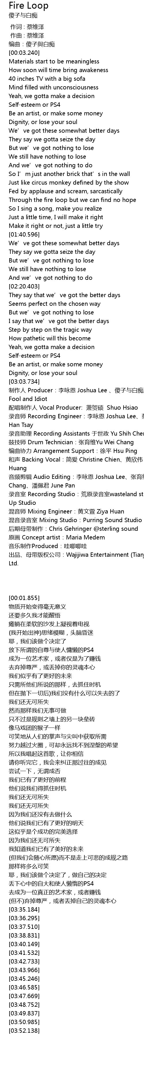 | [03:35.184] | zhì zuò rén Producer: lǐ yǒng ēn Joshua Lee shǎ zi yǔ bái chī yuè duì Fool and Idiot |