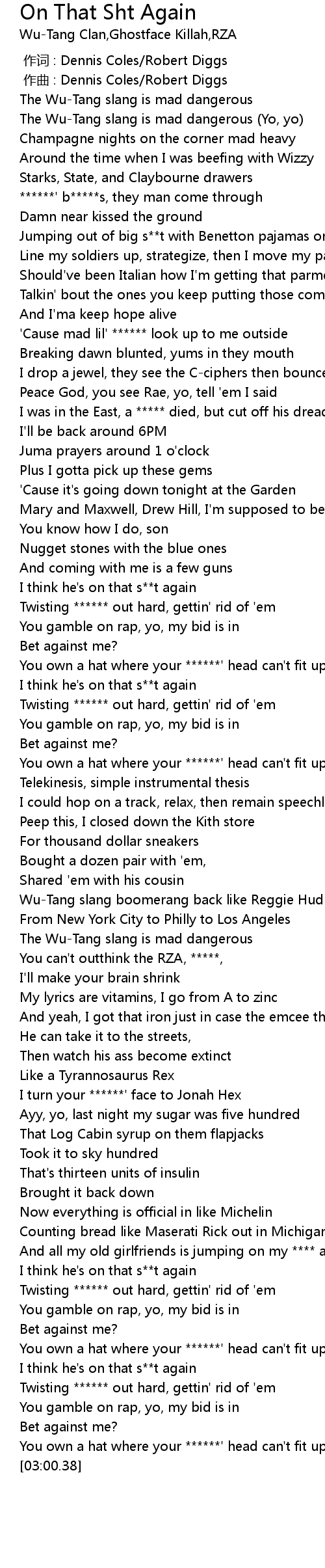 | [00:09.71] | The Wu-Tang slang is mad dangerous (Yo, yo) |