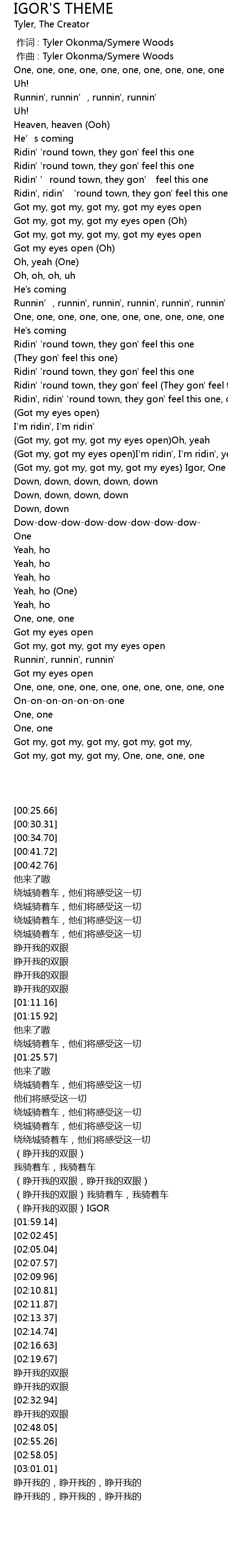 | [01:57.60] | Got my, got my, got my, got my eyes Igor, One |