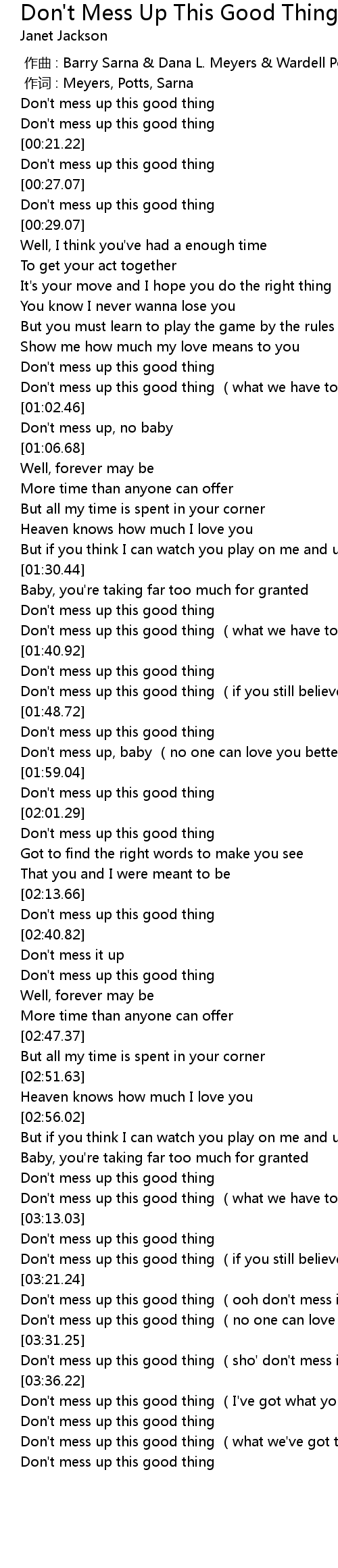 | [03:22.93] | Don't mess up this good thing (ooh don't mess it up baby) |