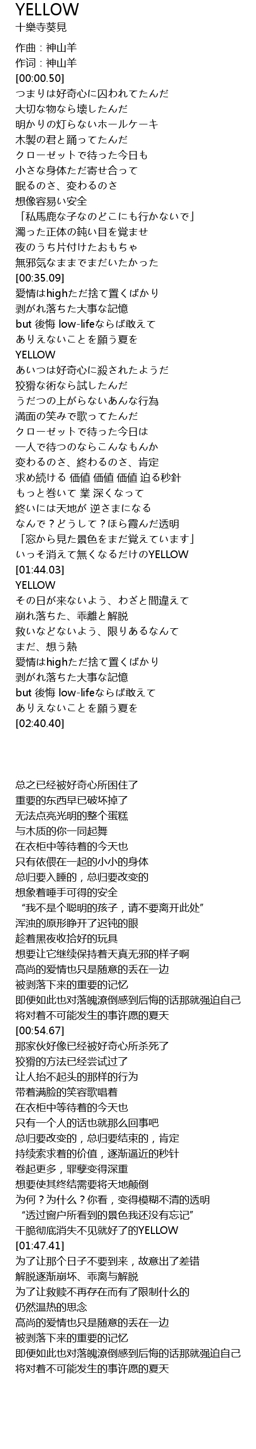 | [01:39.46] | いっそ消えて無くなるだけのYELLOW |