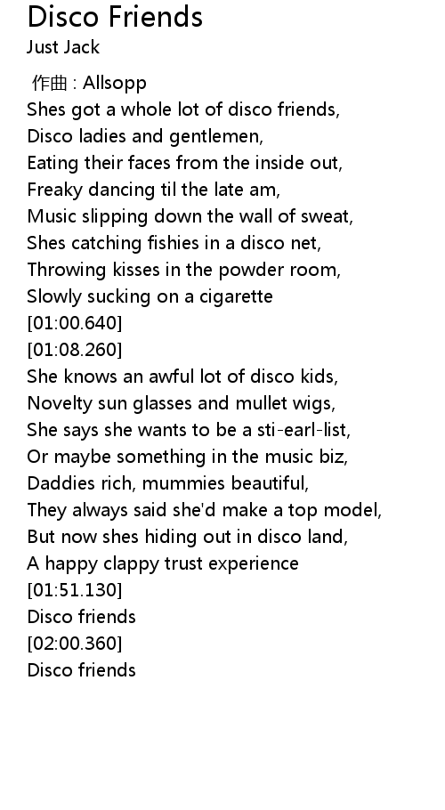 | [00:20.660] | Shes got a whole lot of disco friends, |