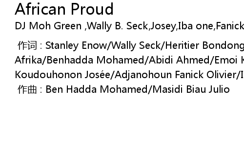 | [00:00.000] | zuo ci : Stanley Enow Wally Seck Heritier Bondongo Dub Afrika Benhadda Mohamed Abidi Ahmed Emoi Kani Anvame Je re my Jeff Gnakrou Koudouhonon Jose e Adjanohoun Fanick Olivier Ibrahim Mahamadou Fily Sissoko |