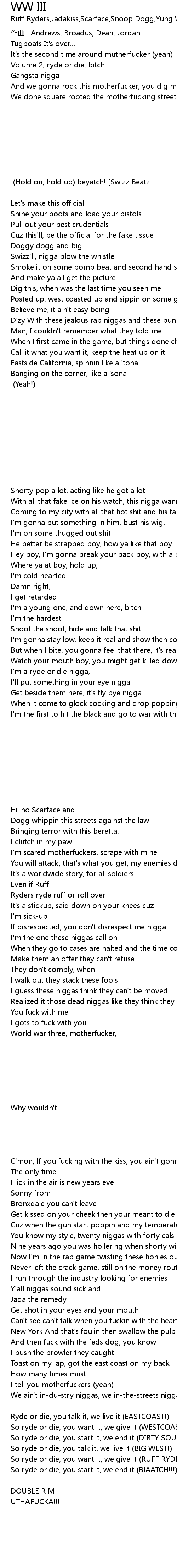 | So ryde or die, you start it, we end it BIAATCH!!! repeat chorus hollering then fade to end | |