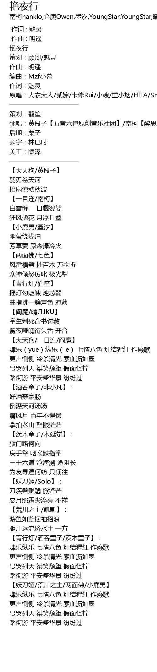 | [00:21.497] | 翻唱:黄段子【五音六律原创音乐社团】/南柯【醉思阙】/墨汐/七色/鹤笙/晴几IKU【尘韵清魂】/非小凡/木延觉/Solo/凯凯【茶贰居】 |