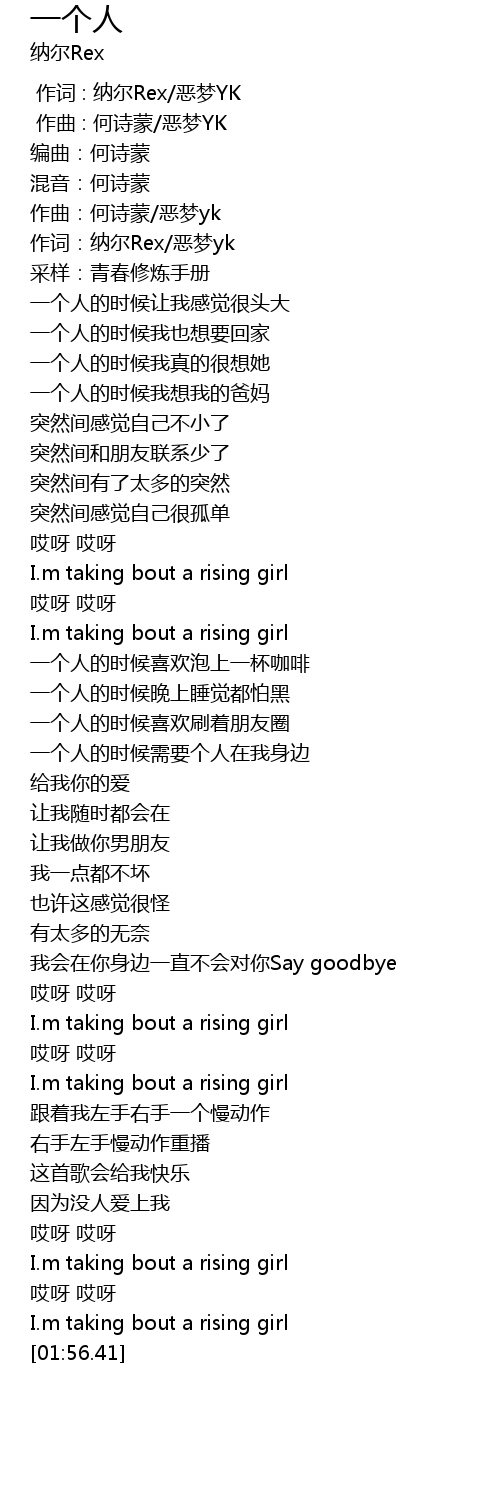 | [01:00.620] | 一个人的时候需要个人在我身边 |
