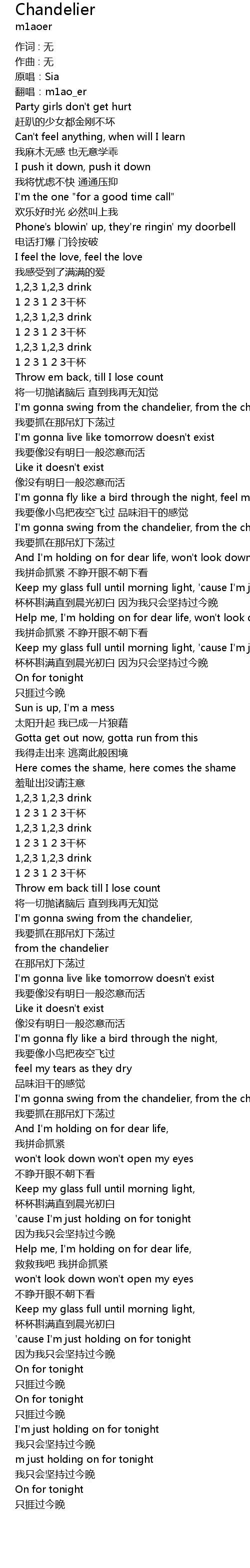 | I'm gonna swing from the chandelier, from the chandelier | |