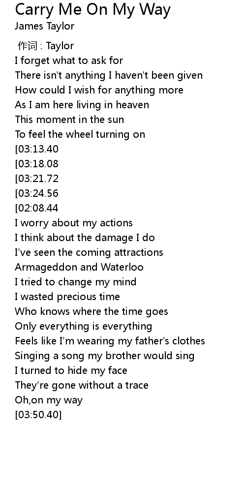 | [03:34.91][03:18.08][01:57.49][01:08.29] | Carry me on my way |