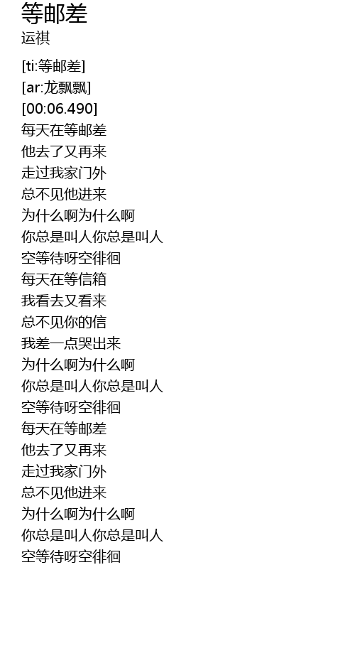 | [01:06.893] | měi tiān zài děng xìn xiāng |