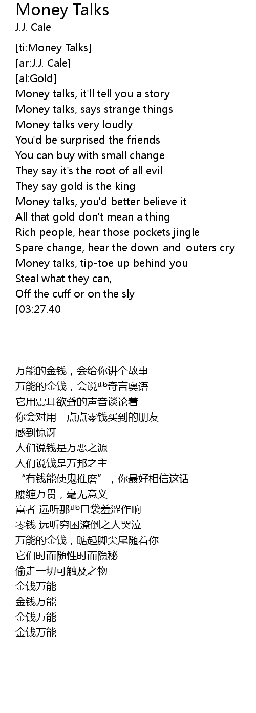 | [03:22.50][03:27.40][03:32.44][03:37.43] | Money talks |