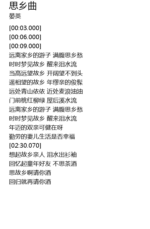 | [03:11.560] | 想起故乡亲人 泪水出衫袖 |