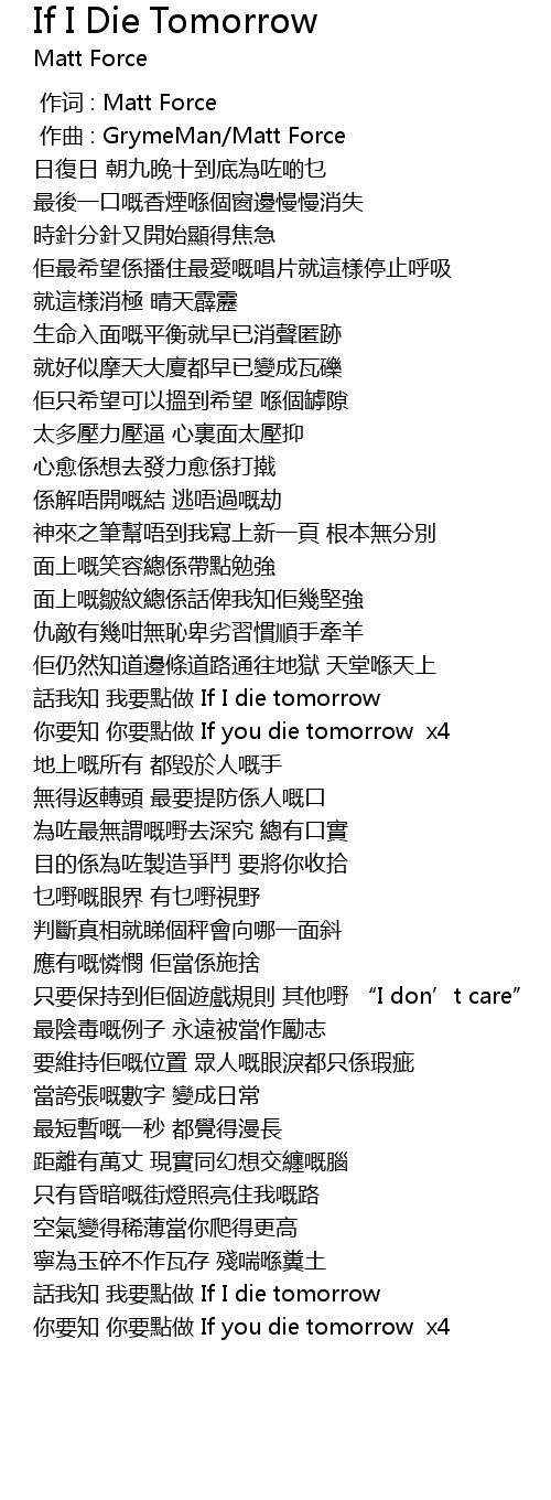 | [02:12.00] | 你要知 你要點做 If you die tomorrow x4 |