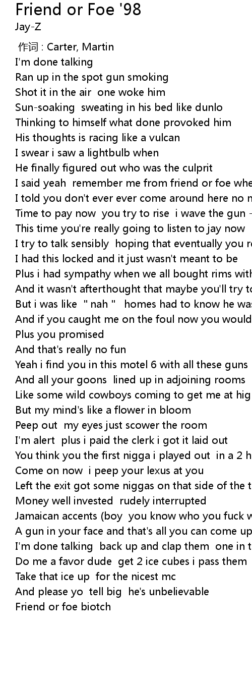 | [00:35.38] | I said yeah remember me from friend or foe when |