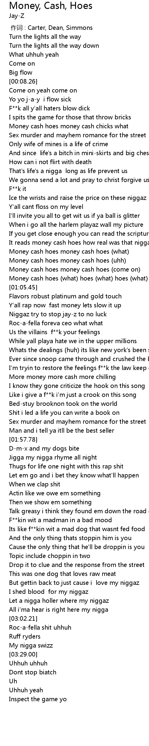 | [00:51.14] | It reads money cash hoes how real was that nigga what |