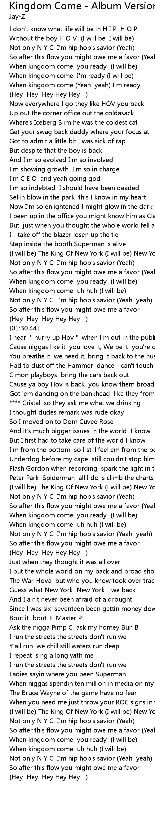 | [00:18.12] | When kingdom come Yeah yeah I' m ready |