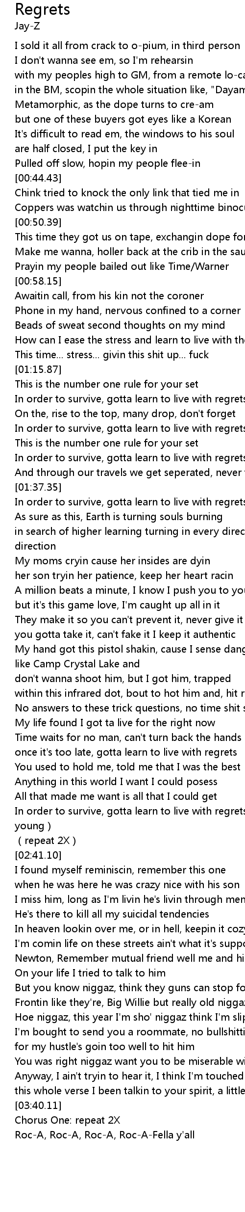 | [01:37.86] | In order to survive, gotta learn to live with regrets |