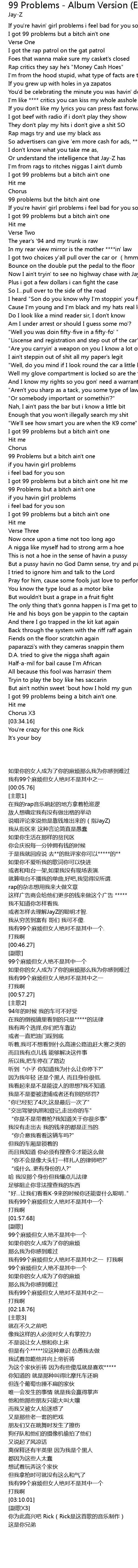 | [01:57.72] | 99 Problems but a bitch ain't one |
