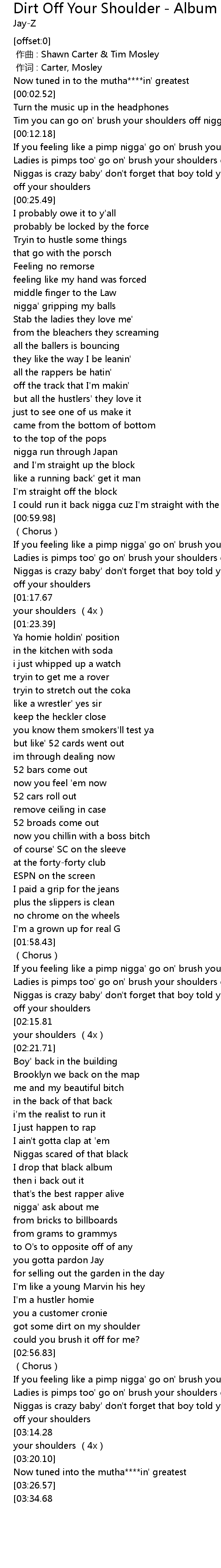 | [03:17.21][03:14.28][03:11.39][03:08.53] | (4x) You gotta get that dirt off your shoulders (4x) |