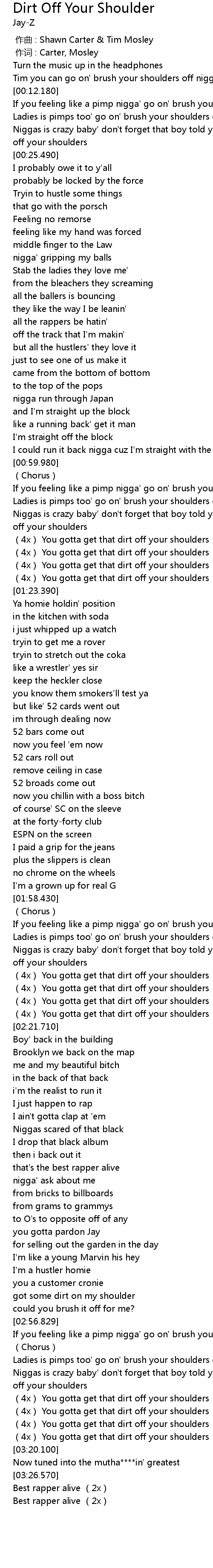 | [01:17.670] | (4x) You gotta get that dirt off your shoulders (4x) |