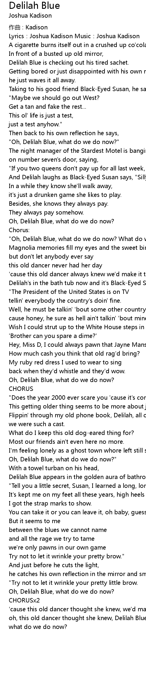 | "Oh, Delilah Blue, what do we do now? What do we do now? | |