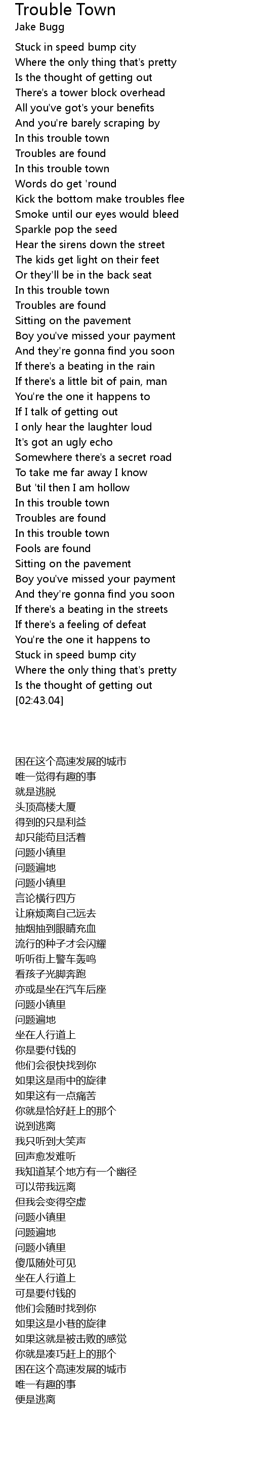 | [02:03.15] | In this trouble town |