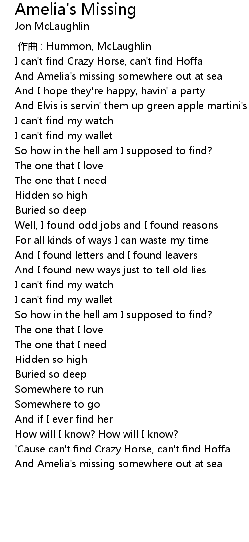 | [00:20.58] | And Amelia' s missing somewhere out at sea |