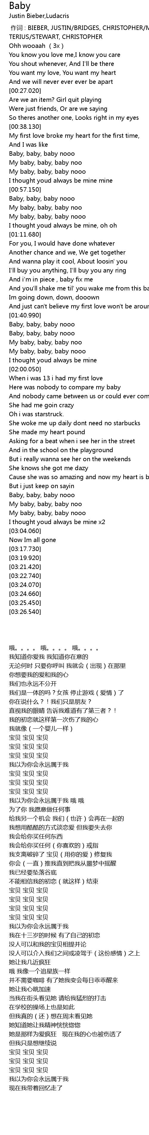 | [00:00.00] | zuo ci : BIEBER, JUSTIN BRIDGES, CHRISTOPHER MILLIAN, C NASH, TERIUS STEWART, CHRISTOPHER |