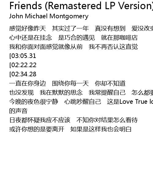 | [03:18.11][02:22.22][01:01.25] | 继续只做普通朋友 我们是否应该要回头 把爱先保留 |