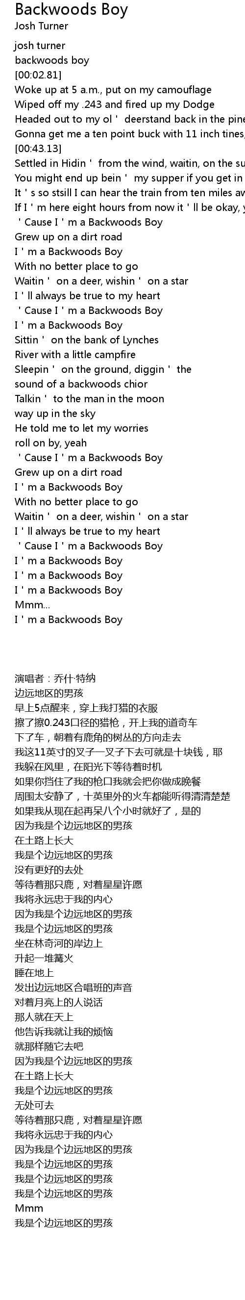 | [01:38.70] | Cause I m a Backwoods Boy |