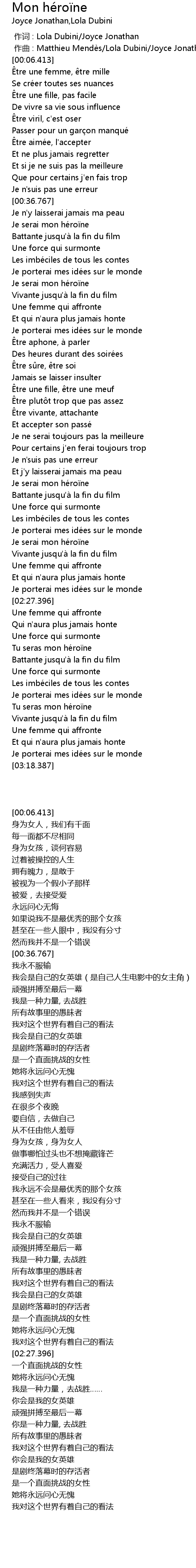 | [00:01.000] | zuo qu : Matthieu Mende s Lola Dubini Joyce Jonathan |